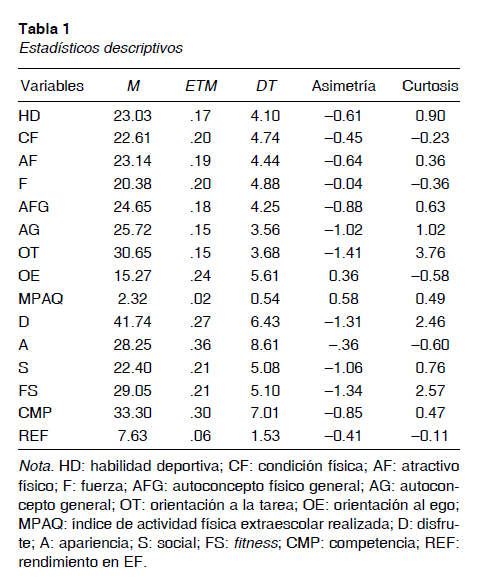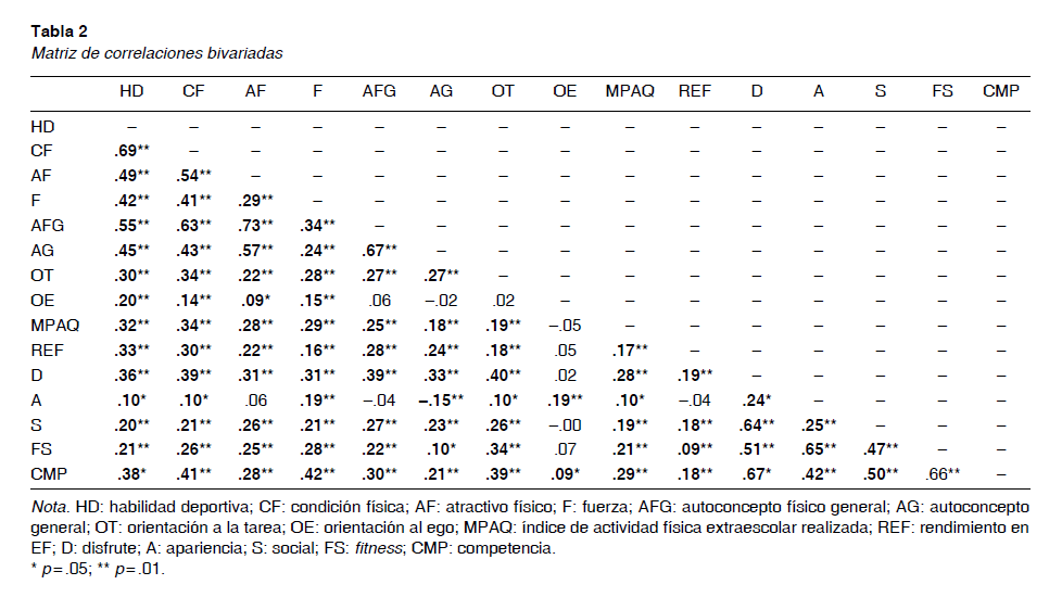 Se muestra en la tabla 2 la matriz de correlaciones entre las variables consideradas en el estudio. La variable apariencia no correlacionaba con las variables atractivo físico, autoconcepto físico general y rendimiento en la asignatura de EF mientras que, por otro lado, sí correlacionaba con la variable orientación al ego que es la variable que menos correlaciones mostró. La orientación al ego no mostró correlación con las variables autoconcepto físico general, orientación a la tarea, práctica de actividad física extraescolar, rendimiento en la asignatura de EF, disfrute, social, fitness y competencia.