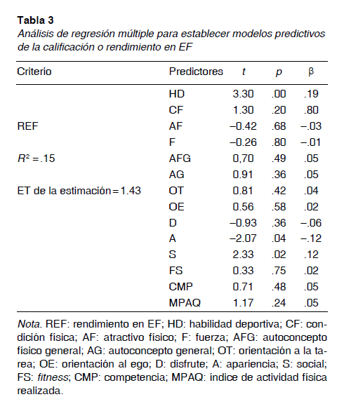 En la tabla 3 aparecen los resultados del análisis de regresión lineal múltiple en los que la variable criterio fue el rendimiento en EF, siendo las restantes las variables predictoras de las cuales solo entraron a formar parte de la ecuación con probabilidades de t estadísticamente significativas (p < .05) las variables habilidad deportiva, apariencia y social. Estas variables dieron cuenta del 15 % de la varianza (R2 = .15).