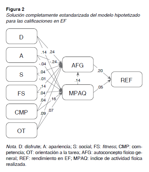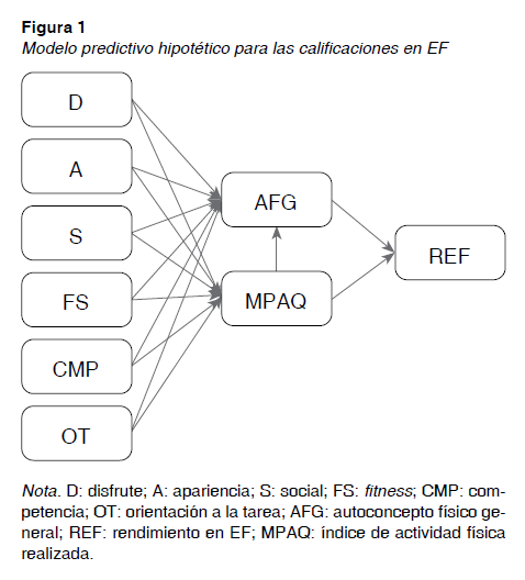 Según las investigaciones consultadas y los resultados obtenidos en el análisis de regresión múltiple se propuso el modelo de la figura 1 en la cual se tuvo en cuenta como variable a explicar el rendimiento en EF y como variables predictoras las restantes. La práctica de actividad física extraescolar guardó relación con el autoconcepto físico general y estas dos variables, a su vez, mostraron estar determinadas por los motivos para practicar actividad física como son el disfrute, la apariencia, la socialización, el fitness, o la sensación de competencia, además de con la orientación de meta a la tarea.
