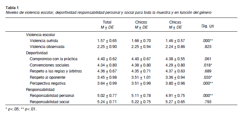 La tabla 1 muestra el nivel de violencia escolar, deportividad, responsabilidad personal y social para el total de la muestra y, en función del género. En este sentido, en relación con el total de la muestra, se observan niveles superiores de violencia observada frente a la sufrida, al tiempo que los niveles más altos en el compromiso con la práctica y más bajos en el respeto al oponente entre las dimensiones de las que compone la deportividad. Además, en lo que concierne a la responsabilidad, la responsabilidad social fue superior a la personal. Por otro lado, atendiendo a las diferencias según el género, los datos relativos a la violencia escolar mostraron que los chicos sufren y observan más violencia que las chicas, aunque estas diferencias son significativas únicamente para la dimensión de violencia sufrida. Con respecto a los niveles de deportividad, los chicos mostraron valores significativamente más altos en las dimensiones de convenciones sociales y respeto al oponente y significativamente más bajos en la perspectiva negativa de la deportividad frente a las chicas. Finalmente, en cuanto a la responsabilidad, se observa que los chicos tienen valores más altos que las chicas en responsabilidad personal, siendo estas diferencias significativas.
