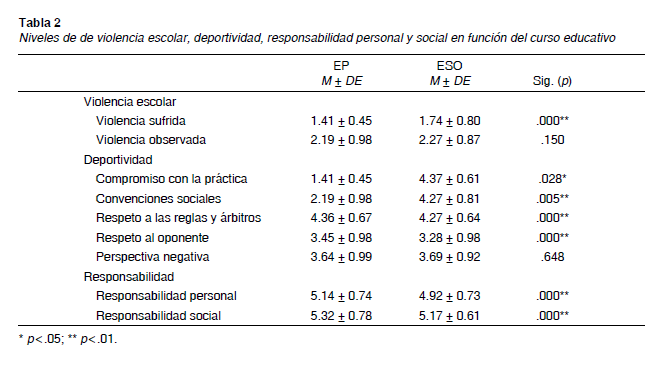 La tabla 2 muestra los resultados del nivel de violencia escolar, deportividad, responsabilidad personal y social en función del nivel educativo. En relación con los resultados obtenidos en violencia escolar cotidiana, cabe destacar que existen mayores niveles de violencia en ESO que en EP, tanto en la violencia sufrida como observada, aunque estas diferencias son significativas únicamente para la dimensión de violencia sufrida. En relación con la deportividad, se han registrado valores significativamente más altos en los estudiantes de EP que en los de ESO en todas las dimensiones de deportividad a excepción de la perspectiva negativa. En cuanto a la responsabilidad, se observan unos valores más altos en la etapa de EP que en la de ESO, apareciendo estos valores significativos tanto en la responsabilidad personal como en la responsabilidad social.