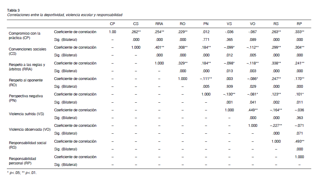 Así mismo, se observó la relación entre las diferentes variables del estudio, destacando la correlación negativa y significativa de las dos dimensiones de la violencia, la sufrida y la observada, con las cinco dimensiones de la deportividad y las dos dimensiones de la responsabilidad; en relación con estos resultados podría afirmarse que la práctica deportiva no genera violencia en los estudiantes. Por el contrario, se encontraron relaciones positivas y significativas entre las cinco dimensiones de deportividad con las dimensiones de responsabilidad, coincidiendo con los estudios de García et al. (2012). De este modo, una mejora de los valores de responsabilidad podría repercutir positivamente sobre los valores de deportividad y reducir los niveles de violencia, sin la necesidad de tener que utilizar un plan de actuación para cada una de las variables.