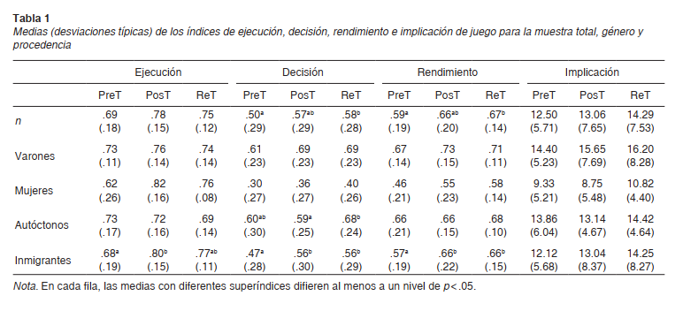 Finalmente, no se hallaron cambios significativos con relación al género, siendo contrario a lo revelado por la literatura (Araujo et al., 2014). Atendiendo a los altos valores de partida en el nivel de ejecución, la ausencia de mejoras en estudiantes de sexo masculino podría ser explicada por un “efecto techo”, circunstancia previamente advertida (Mesquita et al., 2012). Por su parte, aun no habiendo sido objeto de análisis en el presente estudio, desde el plano cualitativo se advirtieron mejoras en estudiantes de bajo nivel de habilidad. Futuras intervenciones deberían considerar el nivel de habilidad junto a otras variables independientes presentes en este estudio (nacionalidad) y explorar su impacto sobre el RJ en alumnado de corta edad.