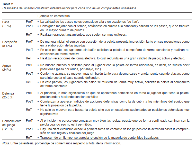 Los componentes resultantes y sus descriptores fueron: a) pase (eficaz: el balón llega, con velocidad adecuada a un compañero desmarcado; ineficaz: va demasiado alto, demasiado lejos, atrasado o adelantado, o es cortado por un contrario); b) recepción (eficaz: el jugador controla el pase y queda en disposición del balón; ineficaz: el jugador no logra controlar el pase); c) apoyo ofensivo (apropiado: se mueve a una posición adecuada para recibir un pase, encuentra un espacio libre; inapropiado: no se sitúa en un lugar adecuado para la recepción del balón; permanece estático), y d) defensa (apropiado: se sitúa en la trayectoria entre el balón y el atacante sin balón, mostrándose activo; inapropiado: se sitúa fuera de la trayectoria entre el balón y el atacante sin balón, permaneciendo estático y/o ajeno al juego). Se obtuvieron los índices de EJ-A (ejecuciones eficaces/suma de ejecuciones eficaces e ineficaces), TD (decisiones apropiadas/suma de decisiones apropiadas e inapropiadas), RJ [(E+D)/2] e implicación en juego (IJ = sumatorio de todas las acciones realizadas por un sujeto).