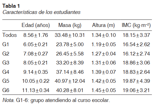 El total de la muestra fue dividido en seis grupos atendiendo al curso escolar que cursaban los estudiantes, denominados, primer curso (G1, n = 20), segundo curso (G2, n = 24), tercer curso (G3, n = 21), cuarto curso (G4, n = 21), quinto curso (G5, n = 22) y sexto curso (G6, n = 23) de EP. En la tabla 1 se presentan la edad, la masa corporal, la altura y el índice de masa corporal (IMC) del total de los participantes y de cada uno de los grupos. Antes de comenzar la investigación, los participantes fueron informados sobre los procedimientos, metodología, beneficios y posibles riesgos del estudio y todos los padres, madres o tutores legales firmaron el consentimiento informado. El estudio siguió las pautas marcadas en la Declaración de Helsinki (Asociación Médica Mundial, 2013) y fue aprobado por el Comité de Ética para la Investigación con Seres Humanos (CEISH código 2015/147) de la Universidad del País Vasco.