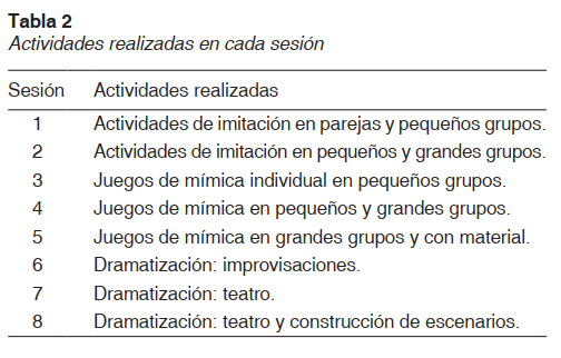 Programa de intervención. El programa tuvo una duración de 8 semanas, con una sesión semanal por grupo de 90 minutos. Todas las sesiones empezaron con un calentamiento estandarizado de 10 minutos, que consistía en una primera fase general de activación muscular, y una segunda más específica para contenidos de EC. En la parte principal de la sesión los estudiantes realizaron actividades de expresión corporal adaptadas a su edad, tales como mímica, imitar a un compañero o tareas de teatro. (Tabla 2)