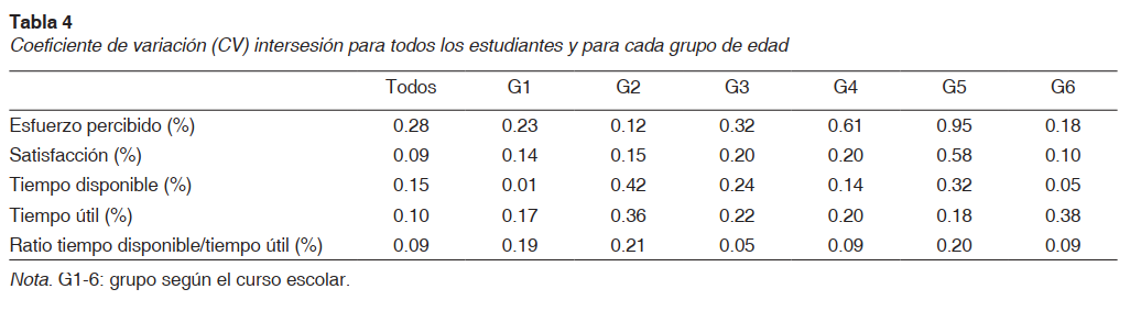 En la tabla 4 se presentan los resultados del CV intersesión para el esfuerzo percibido, la satisfacción, el tiempo disponible y tiempo útil para todos los estudiantes y para cada grupo de edad.
