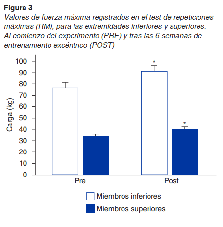 Se obtuvo una mejora en los test de fuerza realizados tras las 6 semanas de entrenamiento, especialmente significativa para las extremidades inferiores (p < .01), donde los valores de RM de los participantes mejoraron de 76.53 ± 21.97 kg, hasta 89.46 ± 24.78 kg, tras las 6 semanas de entrenamiento. Para las extremidades superiores, los valores también mejoraron (p < .05), de 34.34 ± 7.01 kg a 39.20 ± 7.86 kg (figura 3).