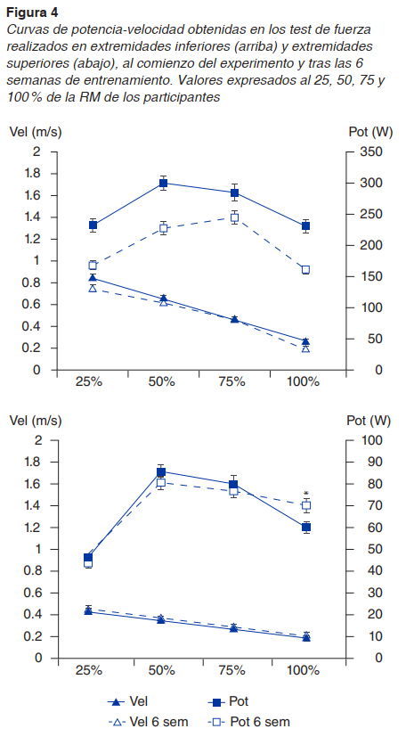 Las curvas de potencia-velocidad obtenidas en los test de fuerza mostraron una mejoría en la ejecución de los ejercicios tanto en potencia como en velocidad, especialmente significativa en los valores de potencia de las extremidades inferiores (figura 4, arriba), ejecutadas al 25 (p < 05), 50 (p < .01), 75 (p < .05) y 100 % de la RM (p < .05). Sin embargo, los valores obtenidos en las extremidades superiores se mantuvieron iguales tras las 6 semanas de entrenamiento en las ejecuciones al 25, 50 y 75 % de la RM y estos valores incluso fueron peores al 100 % de la RM (figura 4, gráfico inferior).