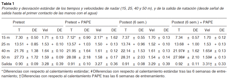 El análisis reveló diferencias en tiempo y velocidades de nadar en 15 metros tras el calentamiento de PAPE en comparación con el calentamiento estándar (T15: F3.48 = 5.073; p = .028; V15: F3.48 = 5.082; p = .031), pero no hubo diferencias ni en el resto de la prueba ni tras las 6 semanas de entrenamiento, tanto después del calentamiento estándar como después del calentamiento de PAPE (tabla 1). Se obtuvieron diferencias en los tiempos y velocidades de nadar tras aplicar el PAPE después de las 6 semanas de entrenamiento, en comparación con el calentamiento estándar tras las 6 semanas de entrenamiento en las marcas de 40 y 50 metros (T40_PAPE: F3.48 = 4.625; p = .045; V40_PAPE: F3.48 = 4.028; p = .039; T50_PAPE: F3.48 = 5.795; p = .024; V50_PAPE: F3.48 = 4.982; p = .033). Sin embargo, no se encontraron diferencias estadísticamente significativas a los 25 metros pese a que los valores también fueron mejores tras el PAPE (tabla 1).
