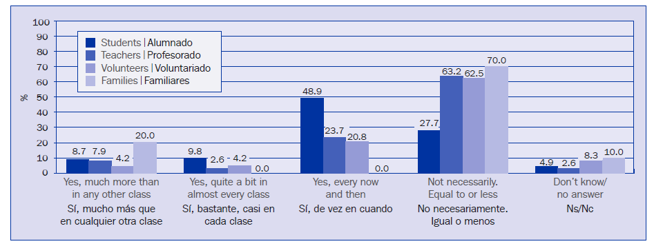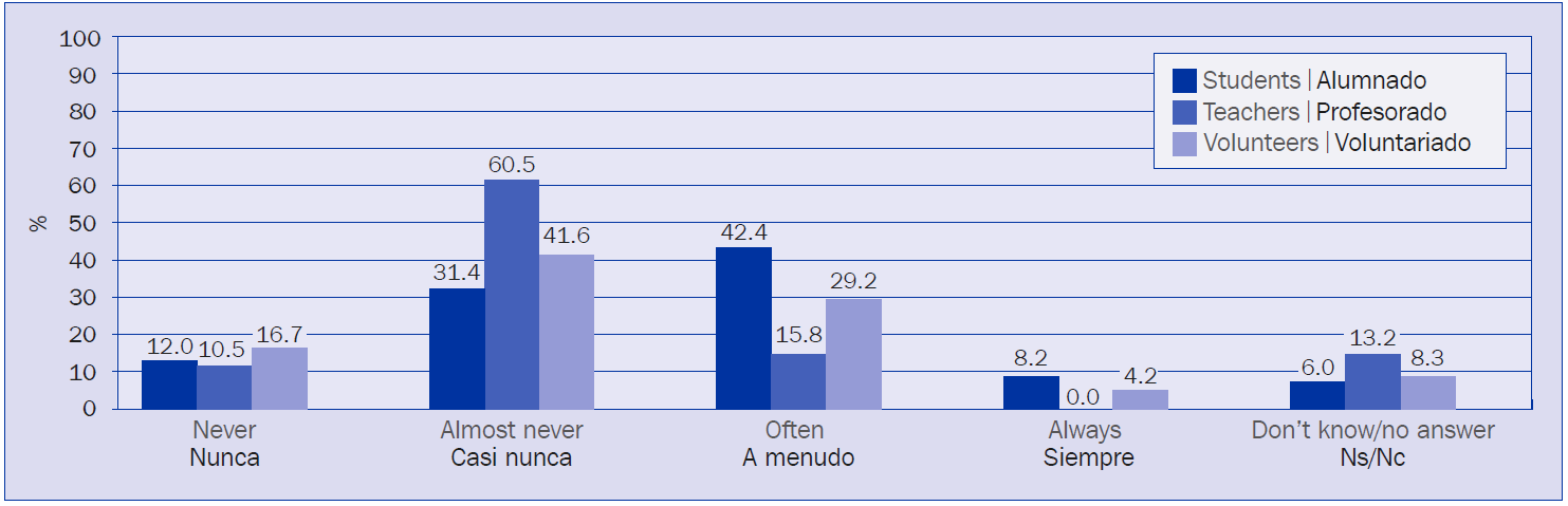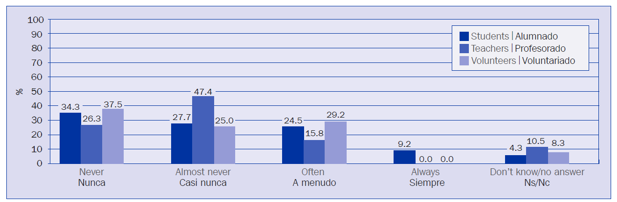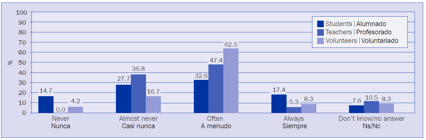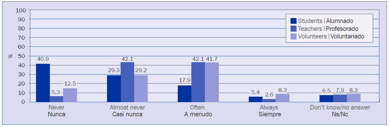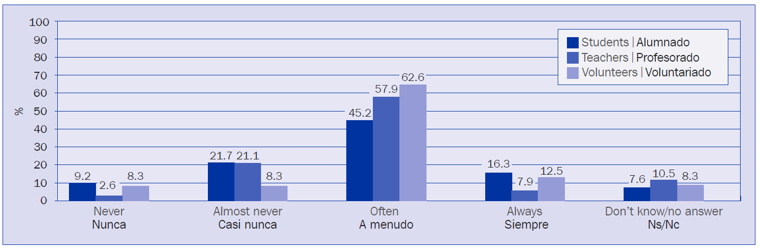 En lo que respecta a la primera variable mencionada, el sumatorio de las opciones de “a menudo” y “siempre” generan conflictos, en un 50% para el alumnado, un 52.7% para el profesorado y un 70.8% para el voluntariado (fig. 3).