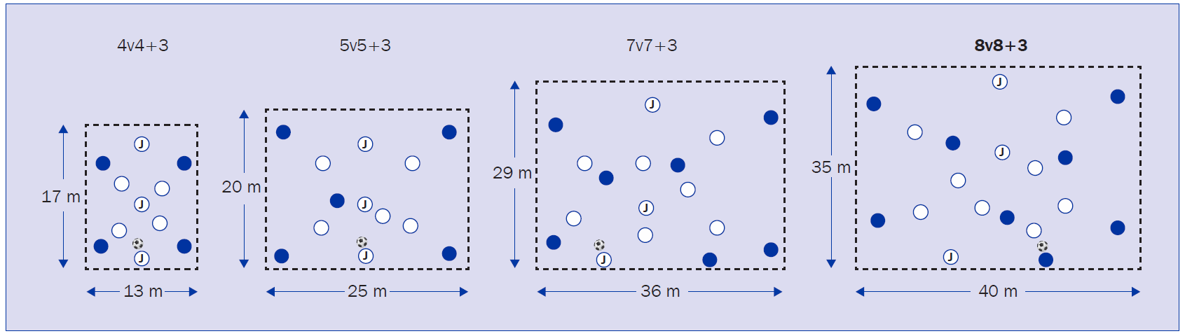 Sólo se estudiaron los JP más utilizados durante la temporada: (1) 4v4+3 comodines, dimensiones: 13 × 17 m, superficie por jugador: 20.1 m2; (2) 5v5 + 3 comodines, dimensiones: 25 × 20 m, superficie por jugador: 38.5 m2; (3) 7v7+3 comodines, dimensiones: 29 × 36 m, superficie por jugador: 61.4 m2; (4) 8v8+3 comodines, dimensiones: 40 × 35 m, superficie por jugador: 73.7 m2 (fig.1).