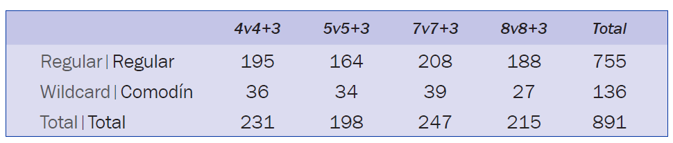 El número de registros en cada JP para los jugadores regulares y comodines se muestra en la tabla 1. Los JP se realizaron en una superficie de césped natural. Durante los JP, se intentó maximizar el tiempo de juego efectivo a través del reemplazamiento rápido del balón una vez que esté salía fuera de los límites del terreno de juego (Casamichana & Castellano, 2010). En el análisis de los JP se excluyeron las pausas entre repeticiones. Las duraciones de los JP fueron de 02:45 ± 00:36 en 4v4+3, 03:52 ± 00:44 en 5v5+3, 05:18 ± 00:41 en 7v7+3 y 05:24 ± 00:38 en el 8v8+3.