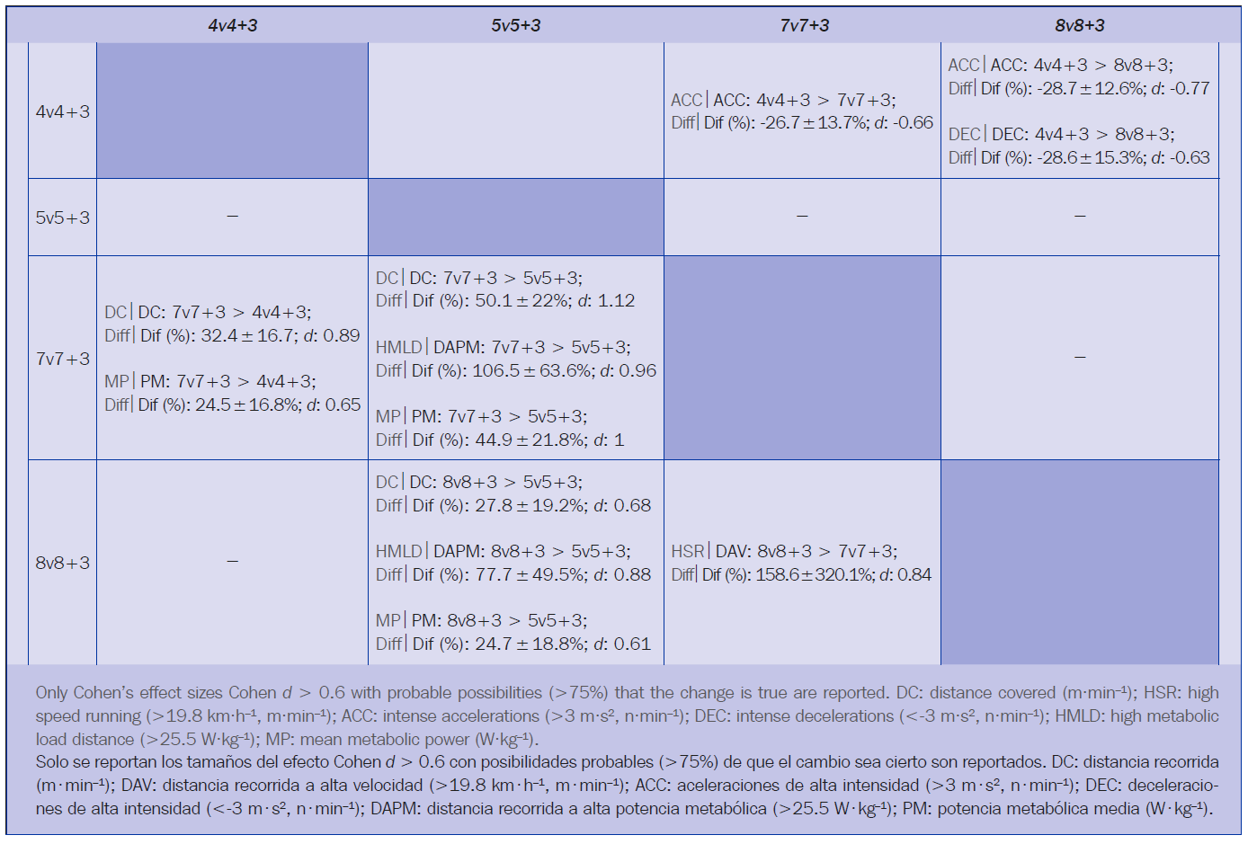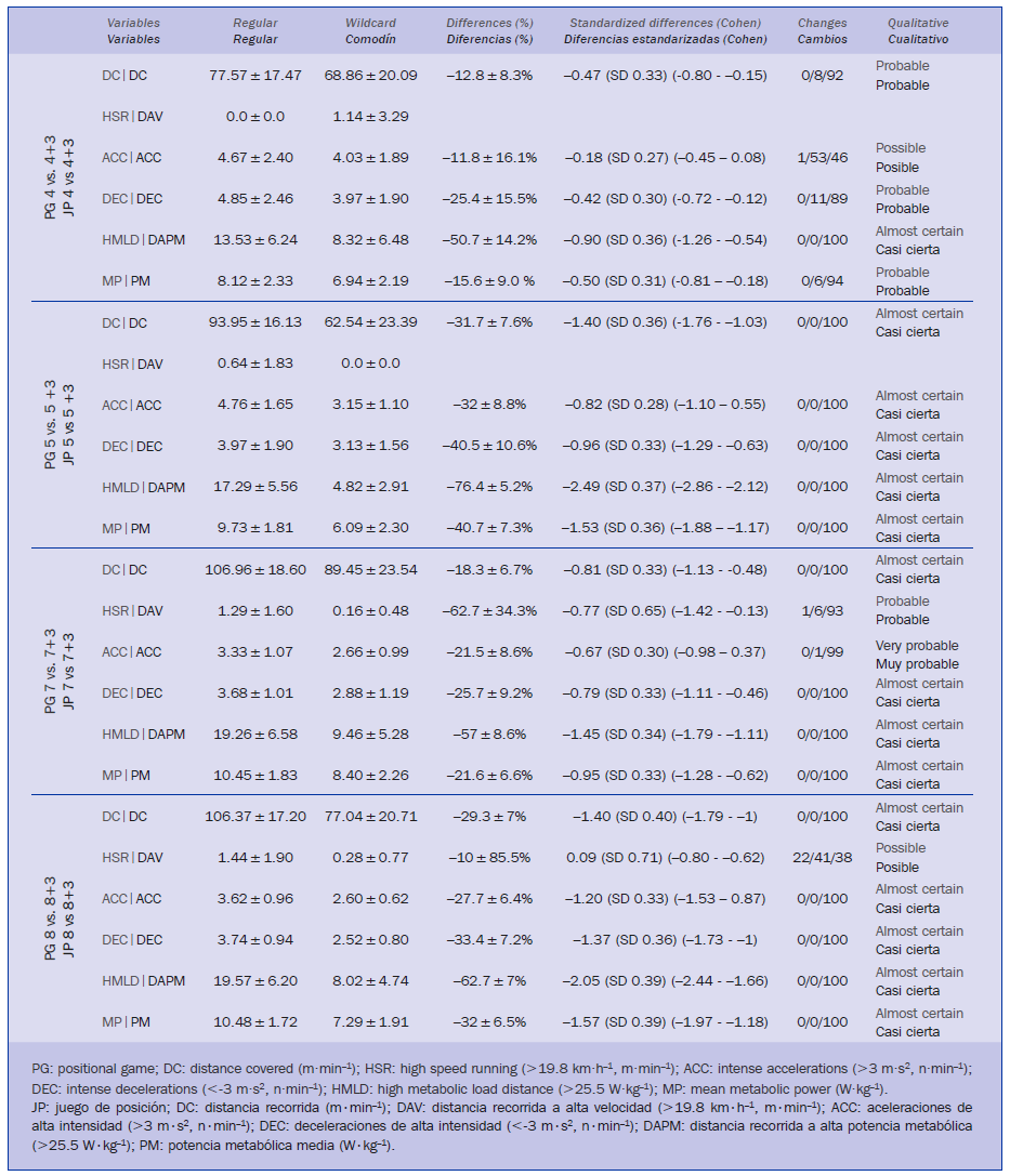 La comparativa entre la demanda impuesta a los jugadores comodines y a los jugadores regulares en los diferentes JP estudiados aparece en la tabla 2. Podemos observar como excepto en el JP de 4v4+3 donde las diferencias entre los jugadores comodines y regulares son desde nulas (.: 0.18 ± 0.27) hasta moderadas (.: 0.90 ± 0.36), en el resto de formatos de JP las diferencias son entre moderadas (.: 0.67 ± 0.30) y muy largas (.: 2.05 ± 0.39).