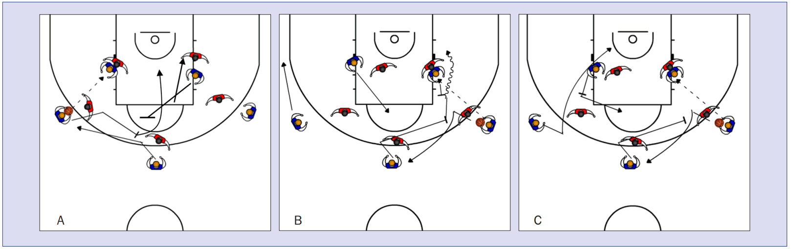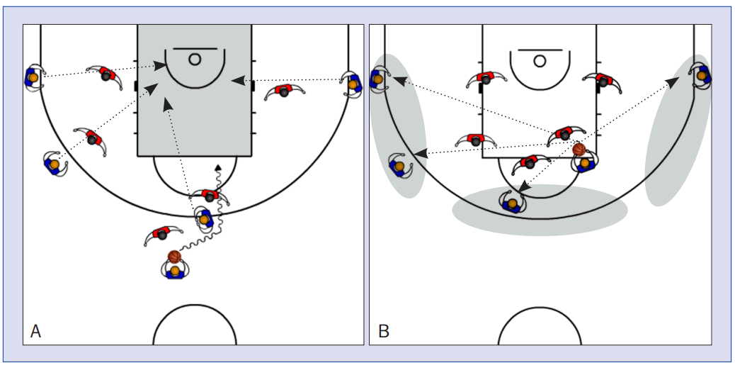 Para una adecuada ocupación y desocupación de los espacios, los jugadores deben interactuar a través de acciones específicas tanto individuales como colectivas, con y sin el balón (Cárdenas, Piñar, Sánchez, & Pintor, 1999). Por ejemplo, un jugador exterior que progresa hacia la canasta botando el balón puede superar a la defensa valiéndose de su capacidad individual de dribbling, o bien con la ayuda de un bloqueo directo. Seguidamente, podrá finalizar la acción con un lanzamiento a canasta o bien realizar un pase a un compañero que esté mejor situado en el interior, como por ejemplo, a la continuación del bloqueo o un cruce por la espalda de un compañero (fig. 1A). En caso de que la defensa dificulte las opciones de pase o lanzamiento en el interior, se buscará un pase hacia espacios libres en el exterior (fig. 1B). Una reciente revisión señala una mayor eficacia de ataque cuando los jugadores realizan acciones orientadas al aprovechamiento de la ventaja espacial interior y exterior (Courel-Ibáñez, McRobert, Ortega, & Cárdenas, 2017). Sin embargo, existen carencias en el desarrollo de aplicaciones prácticas orientadas al entrenamiento de la capacidad táctica, organización y toma de decisiones de los jugadores en baloncesto.