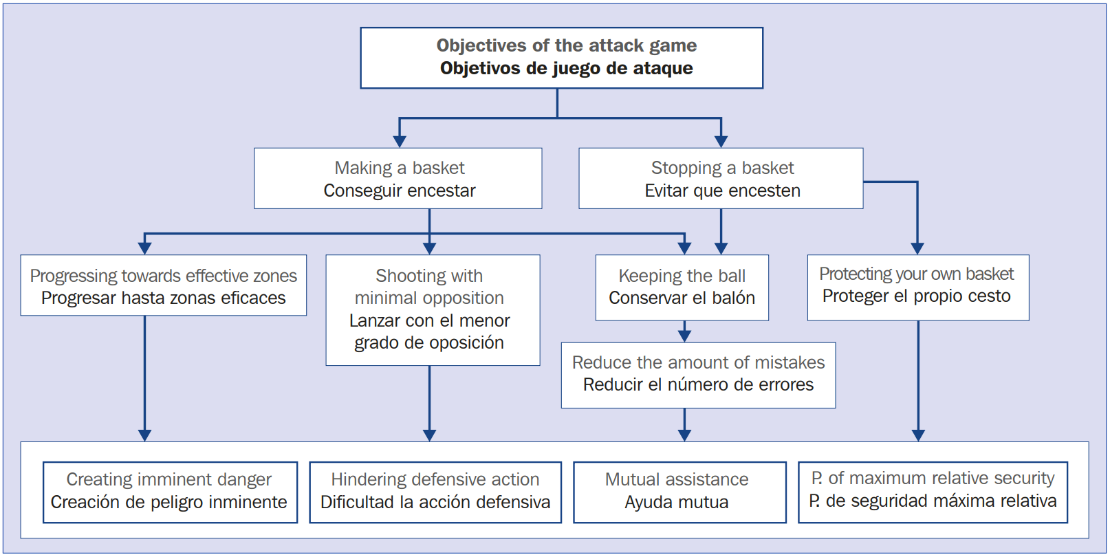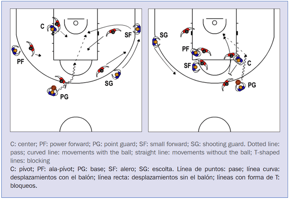 Una de las características que se relacionan con los deportes de equipo, como el baloncesto, es la necesidad constante de los jugadores de interactuar en un entorno cambiante para responder a los problemas que surgen en la competición (Davids et al., 2003; Garganta, 2009). Este comportamiento viene determinado por una serie de objetivos que conllevan unos principios de juego o normas de actuación que serán las que determinen las pautas de comportamiento eficaz (Cárdenas & Alarcón, 2010; Gréhaigne et al., 2005). Así, para cumplir con el objetivo principal del juego, es decir, encestar más puntos que el rival, el equipo atacante deberá, ante todo, conservar la posesión del balón para progresar hacia zonas que le permitan ser eficaz y generar opciones de lanzamiento ante una menor oposición defensiva, aumentando con ello las probabilidades de éxito. Para favorecer el cumplimiento de estos objetivos, los jugadores deberán desarrollar un juego dinámico que provoque desequilibrios defensivos, crear espacios libres para generar situaciones óptimas de lanzamiento, o generar incertidumbre y variar los recursos ofensivos utilizados para sorprender a la defensa (fig. 2).