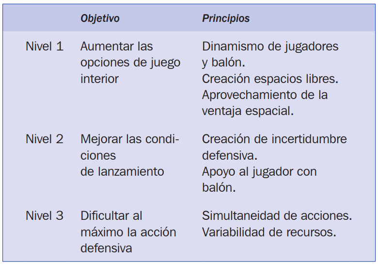 En la tabla 1 se muestra la estructura de los objetivos y principios del juego para la mejora táctica del juego interior en tres niveles en orden creciente de dificultad. Los principios de juego o pautas de actuación en cada nivel surgen a partir de unos objetivos cada vez más complejos y exigentes. Así, el entrenamiento de contenidos propios del nivel 3 implicará previamente un dominio, o al menos un conocimiento profundo, de los niveles anteriores. Siguiendo las recomendaciones de trabajos previos sobre enseñanza y aprendizaje deportivo (Famose, 1992; López Ros, 2003; López Ros & Castejón, 2005), para la correcta organización de las diferentes etapas se han tenido en cuenta la complejidad de la toma de decisiones, las características perceptivas y las características motoras.
