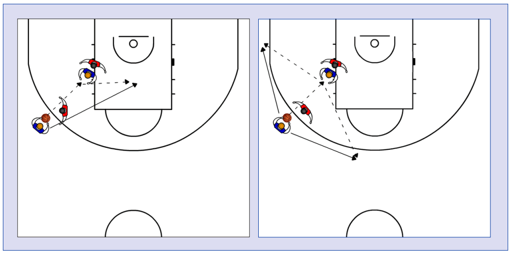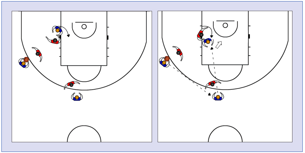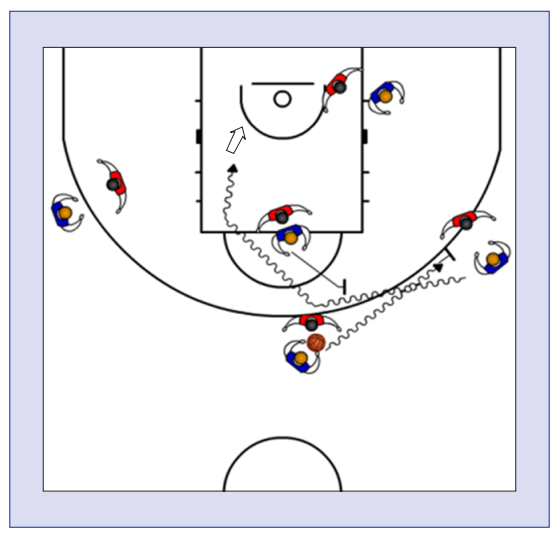Apoyo activo una vez se haya producido el pase. En esta fase, estos apoyos consistirán en movimientos individuales con sentido de profundidad (hacia canasta) o periféricos (fig. 4), que permitan conseguir dos objetivos: por un lado, aumentar posibles ángulos de pase para jugar dentro-fuera, en caso de que el jugador interior no pueda superar a su oponente y, por otro, evitar posibles ayudas al interior por parte del defensor exterior. Las claves atencionales que guiarán al atacante para elegir la conducta más eficaz se centran en el comportamiento de su oponente directo: cuando el defensor gira su cabeza o cuerpo tras el pase interior para observar al receptor o realizar un ayuda defensiva, el pasador progresa hacia canasta por el lado correspondiente a la zona de pérdida de visión (espalda del defensor); cuando el defensor se desplaza para realizar la ayuda sin perder de vista al pasador, este se desplaza por el exterior de la línea de 3 puntos, de forma periférica, hacia el lado donde aumentará la distancia respecto a su oponente o se dificultará su recuperación defensiva (en caso de que el receptor volviera a sacar el balón al exterior).