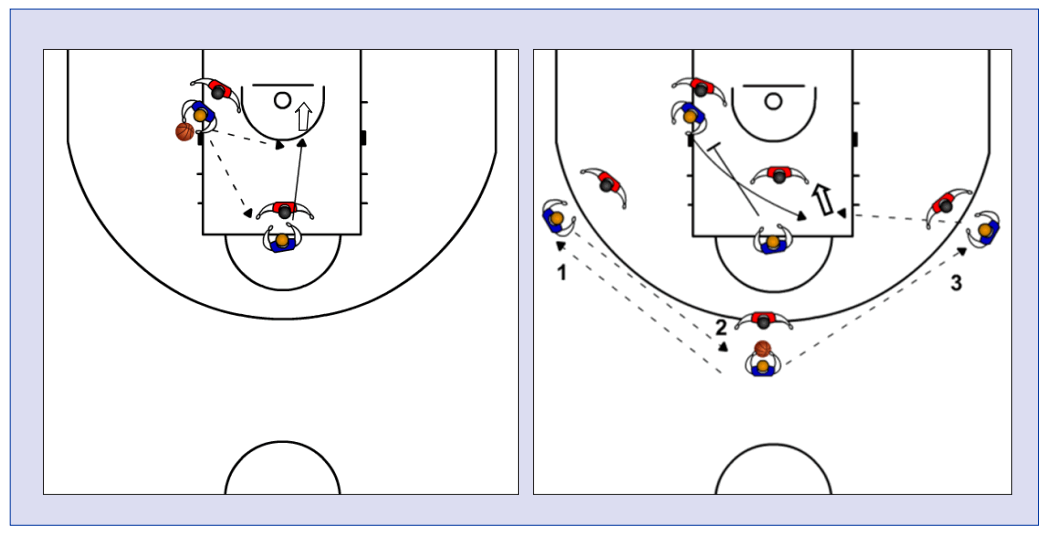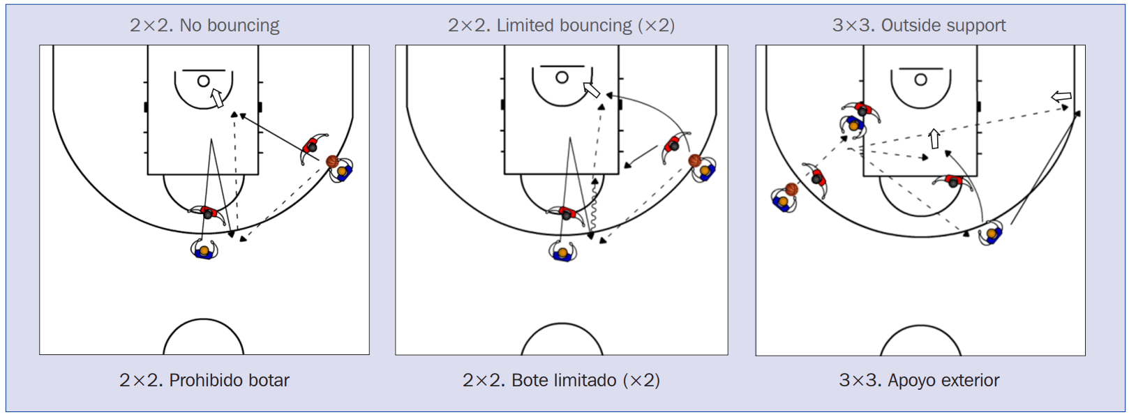 Para potenciar las acciones tácticas anteriores, se pueden plantear distintas tareas con normas. Por ejemplo, para potenciar el juego en triángulo, se puede establecer que “el defensor del jugador interior tiene que defender por delante a su par obligatoriamente y antes de lanzar a canasta tiene que producirse, al menos, un pase interior”. Si se quieren potenciar distintas continuaciones tras bloqueo directo, se podría obligar al oponente del bloqueador a realizar ayudas al jugador con balón, como por ejemplo “saltar a robar balón lo antes posible”. En estos casos, el jugador interior que actúa como bloqueador tendría que continuar rápido hacia el interior.