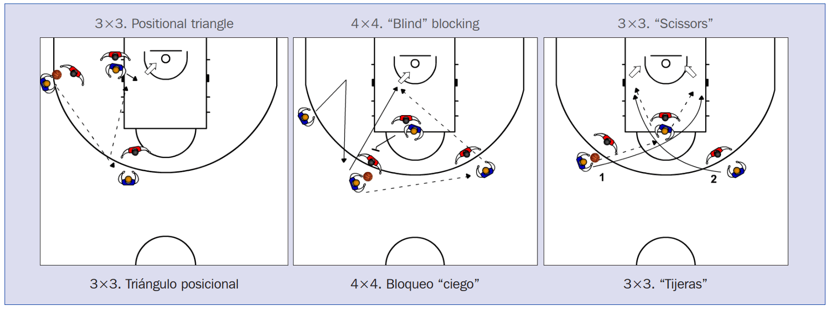 Conocimiento y uso de las acciones tácticas entre exteriores y poste alto. En caso de que el jugador interior ocupe zonas intermedias o de poste alto, los jugadores exteriores buscarán apoyos en el exterior, creando espacio libre para un posible 1×1 del poste alto frente a su defensor, o bien aprovechar la posición de su compañero y realizar cruces con bloqueos semi-directos o “mano a mano”, situación conocida como “tijeras” (fig. 6).