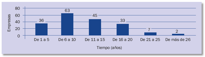 Se observa que la concentración de empresas se centra entre el año y los 20 años siendo un 95,1 %. Se identifica la juventud del sector entre los seis y los diez años y una madurez de este entre los once y los quince años con un 24,2 % de las empresas.