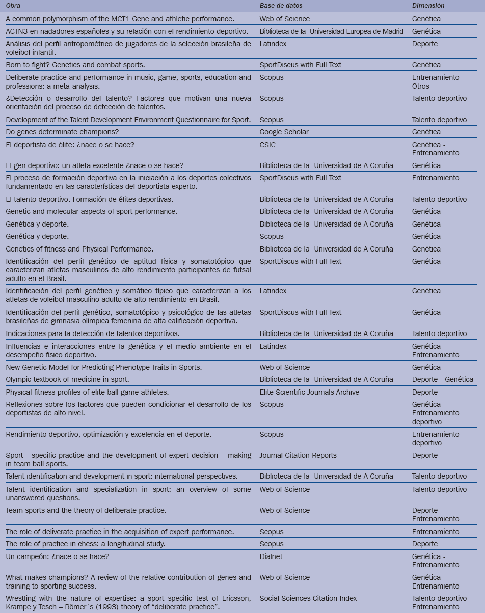 La selección de la documentación analizada se realizó mediante una búsqueda temática en diversos fondos bibliográficos (tabla 1). Los escritos fueron seleccionados en base a dos criterios: la relación directa de su temática con el ámbito de estudio y su actualidad. Para ello únicamente se incluyeron en el estudio documentos publicados en los últimos 22 años (1993-2015). Las palabras clave empleadas en la búsqueda de documentación fueron deporte, entrenamiento, genética, y talento deportivo, en castellano, y nature vs nurture, sport, training, sport talent, genetics, en lengua inglesa.