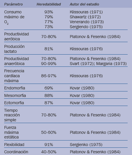 No se puede negar la contribución que la herencia genética tiene en el ámbito del rendimiento deportivo, es más, existen características del deportista que vienen condicionadas genéticamente (Lorenzo & Sampaio, 2005). El hecho de que los seres humanos tengan la capacidad de transmitir rasgos de los progenitores a sus descendientes aporta una gran cantidad de información sobre qué posibilidades de formar parte de la élite deportiva tendrá un sujeto en el futuro (García, Campos, Lizaur, & Pablo, 2003; Horton, 2012). El proyecto del genoma humano demostró que los seres humanos comparten el 99 % de su información genética, hecho que indica que las diferencias apreciadas entre los individuos son debidas a una pequeña proporción de ADN y su interacción con otros factores (Baker, 2012). El ADN del ser humano está formado por 35000 genes, de los que más de 200, según se ha comprobado, tienen una vinculación directa con el rendimiento deportivo (Gómez, 2013). La investigación realizada por Bray et al. (2009), citada en Roth (2011), aproxima la cifra a 230 genes. Williams & Folland (2008, en Baker, 2012) identificaron 23 modificaciones genéticas relacionadas con un alto grado de rendimiento en los deportes de resistencia, también señalaron que las probabilidades de que se den esas variaciones en un único individuo son de 1 entre 20 millones. Resalta el hecho de que, según se estima, casi el 66 % de las diferencias en la capacidad atlética, de media, pueden explicarse mediante factores genéticos aditivos (Gómez, 2013). En función de estas y otras informaciones, numerosos científicos deportivos se han lanzado en la búsqueda de los genes individuales que tendrían influencia en la práctica deportiva, con el fin de mejorar la eficacia de la actividad física, siendo esta, hasta la fecha, poco fructífera (Padullés, Terrados, Rodas, & Campos, 2004). Los efectos de un solo gen son inapreciables para un estudio de poca entidad o están envueltos en una complejidad genética mucho mayor (Epstein, 2014). Sin embargo, diferentes parámetros relacionados con la actividad física sí muestran un elevado porcentaje de heredabilidad (Padullés et al., 2004). Son muchos los estudios que han analizado la heredabilidad de una determinada característica fenotípica o de ciertos parámetros de la condición física (Bouchard et al., 1997; Ruiz, 1999; Magallanes, 2011), con el objetivo de determinar la probabilidad de ser heredados que presentan ciertos rasgos determinantes en el ámbito del rendimiento deportivo (tabla 2).
