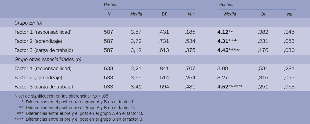 En relación con los cambios acontecidos entre el pretest y el postest se aprecian diferencias significativas en los dos grupos en el factor 3 relativo a la carga de trabajo, aumentándose la media en más de un punto en los dos casos.