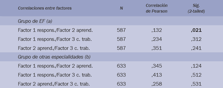 Una vez que ya se ha extraído la significatividad en las diferencias encontradas por factores entre grupos (tabla 1), en la tabla 2se analiza el grado de correlación obtenido de los factores para cada uno de los grupos, lo que permite comprobar el grado de linealidad y concordancia mostrada en las respuestas de los participantes. Se observa cómo únicamente se alcanza la significatividad entre los factores 1 de responsabilidad y 2 de aprendizaje en el grupo de EF (r(587)= ,132, p = ,021). Este hecho demuestra la relación directa obtenida entre ambos factores, siendo en ambas muy positivas, ya que se alcanzaron valores medios superiores a 4,1 puntos.
