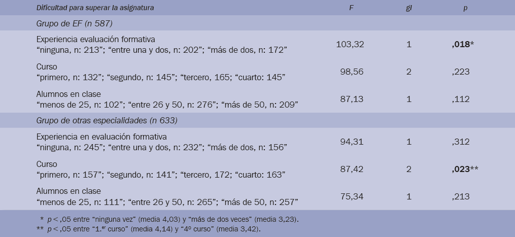 Se observa cómo dentro del grupo de EF existen diferencias a la hora de superar la asignatura entre los alumnos que no han tenido ninguna experiencia de evaluación formativa y aquellos que ya han tenido más de dos a lo largo de la carrera (F(587) = 103,32, p = ,018), siendo estos últimos los que reflejan una menor dificultad. Respecto al grupo de otras especialidades las diferencias se encuentran entre los alumnos de primer y cuarto curso (F(633) = 87,42, p = ,023), comprobándose cómo los alumnos de primer curso encuentran más dificultades para hacer frente a estos sistemas de evaluación. En la variable del número de estudiantes en clase no se encuentran diferencias.