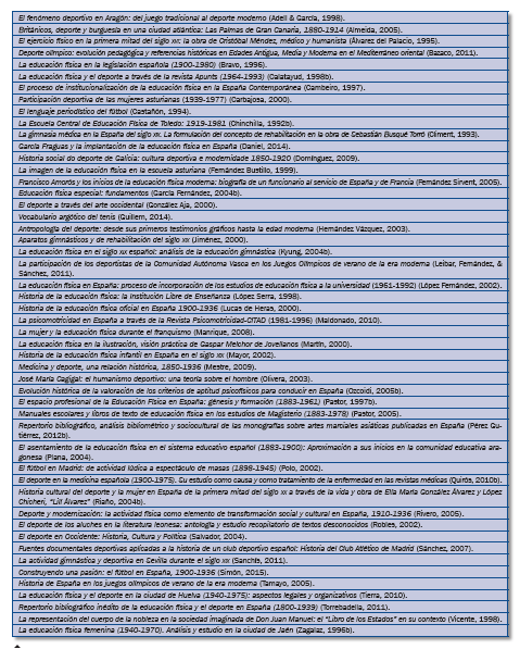 Numerosos trabajos se centran en diversos aspectos del deporte. Se han defendido tesis sobre instituciones deportivas como la Delegación Nacional de Deportes o la Escuela Central de Educación Física de las Fuerzas Armadas. Se ha estudiado sobre la significación del deporte en relación con la modernidad a principios del siglo xx, la evolución del fenómeno deportivo en la transición y la relación entre el deporte y el arte en Occidente hasta el siglo XIX y el siglo XX en Europa. Se han realizado estudios sobre el origen del deporte en su contexto social y cultural a nivel local y autonómico; sobre el origen y evolución de algunos deportes, como la esgrima, la gimnasia, y la lucha leonesa, a nivel local o autonómico; sobre el ciclismo a nivel nacional, concretamente su origen en el siglo XIX y su evolución en la transición española y sobre los inicios del fútbol tanto a nivel local como a nivel nacional. Asimismo, se ha escrito sobre el ordenamiento jurídico del deporte en el franquismo, acerca de los espacios deportivos en Occidente y sobre la actividad deportiva en Sevilla en el siglo XIX (Abadía, 2007; Almeida, 2003;Bielsa, 2004;Chinchilla, 1992a;Domínguez, 2006;Estomba, 2007; García Recellado, 2005; González Aja, 1992;Izquierdo, 2000; Lagardera, 1990; Monroy, 2007; Pérez Verdes, 1998; Piñera, 2011;Polo, 1993; Rivero, 2001;Robles, 2000; Saez, 2010;Salvador, 2006;Sanchís, 2006;Saucedo, 1997;Tierra, 2003).
