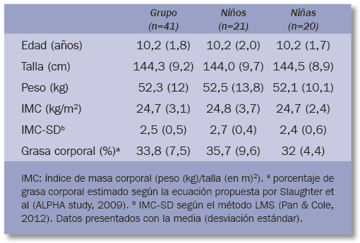 Un grupo de 41 participantes (21 niños y 20 niñas) participó en el estudio (tabla 1). Los niños y las niñas no muestran diferencias estadísticamente significativas entre ellos para ningún parámetro antropométrico.