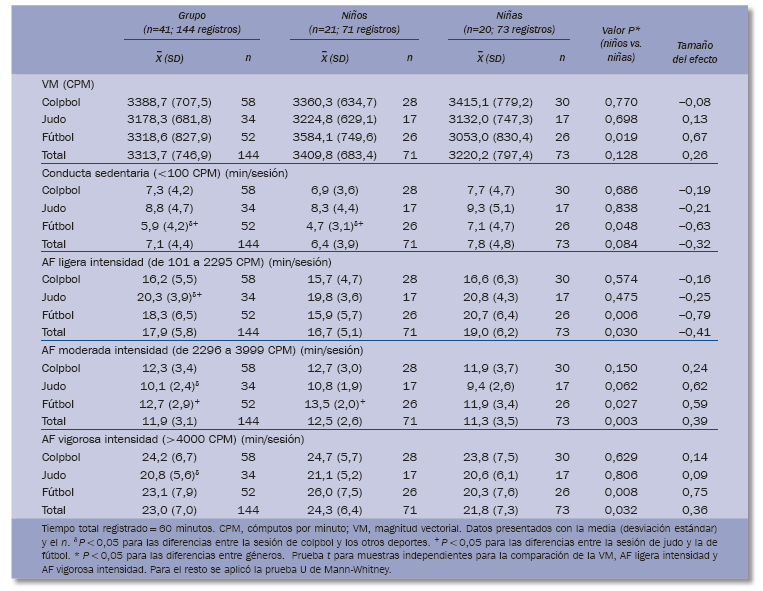 Si se comparan las sesiones según el deporte de la parte principal no se aprecian diferencias estadísticamente significativas en el grado de movimiento global para todo el grupo, ni para los subgrupos de niñas y niños. A pesar de todo, se observa que en las sesiones de judo los participantes están más tiempo realizando actividad física de ligera intensidad (tamaño del efecto: 0,87) y menos tiempo de actividad física de moderada (tamaño del efecto: –0,76) y vigorosa (tamaño del efecto: –0,56) intensidad que en las sesiones de colpbol.