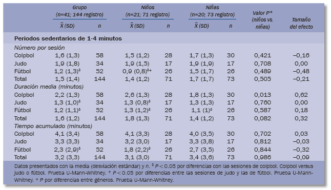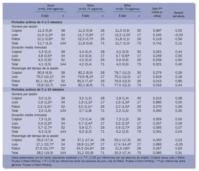 En el conjunto de todas las sesiones, las niñas presentan un número y una duración acumulada de periodos activos de corta duración inferiores que los niños. Esta diferencia puede atribuirse al diferente comportamiento durante las sesiones de fútbol, mientras que no se aprecian diferencias en el número y la duración de los periodos activos de corta duración entre los niños y las niñas para las sesiones de colpbol y judo. En las sesiones de fútbol las niñas acumulan menos tiempo en periodos activos de 0 a 5 minutos de duración y la duración media es ligeramente menor.