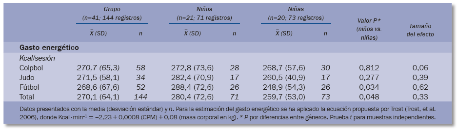 El gasto energético estimado para el conjunto de las sesiones fue de 270,1 kcal/sesión. Este es similar para todos los tipos de sesiones analizadas (tabla 5). No obstante, en general el gasto energético de los niños es superior a la de las niñas para el conjunto de las sesiones, y en particular para las sesiones de fútbol.