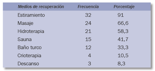 El 87 % de entrenadores (36 sujetos) utilizaron uno o varios medios de recuperación física postejercicio y que se especifican en latabla 1.