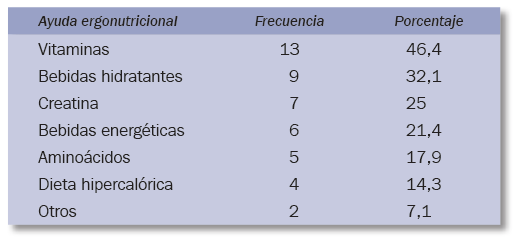 El 68,3 % de los entrenadores (28 sujetos) utilizaron una o varias ayudas ergonutricionales, representadas en la tabla 2.