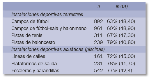 Los estadísticos descriptivos muestran que el porcentaje medio total de seguridad alcanza un 67 % de seguridad en todas las instalaciones deportivas convencionales analizadas. En instalaciones terrestres, los campos de fútbol-sala y balonmano son los que menor grado de seguridad obtienen mientras que las pistas de baloncesto son las que más seguridad consiguen. En piscinas, el mayor porcentaje de seguridad lo consiguen las plataformas de salida mientras que la menor seguridad se registra en las líneas de calles (tabla 1).