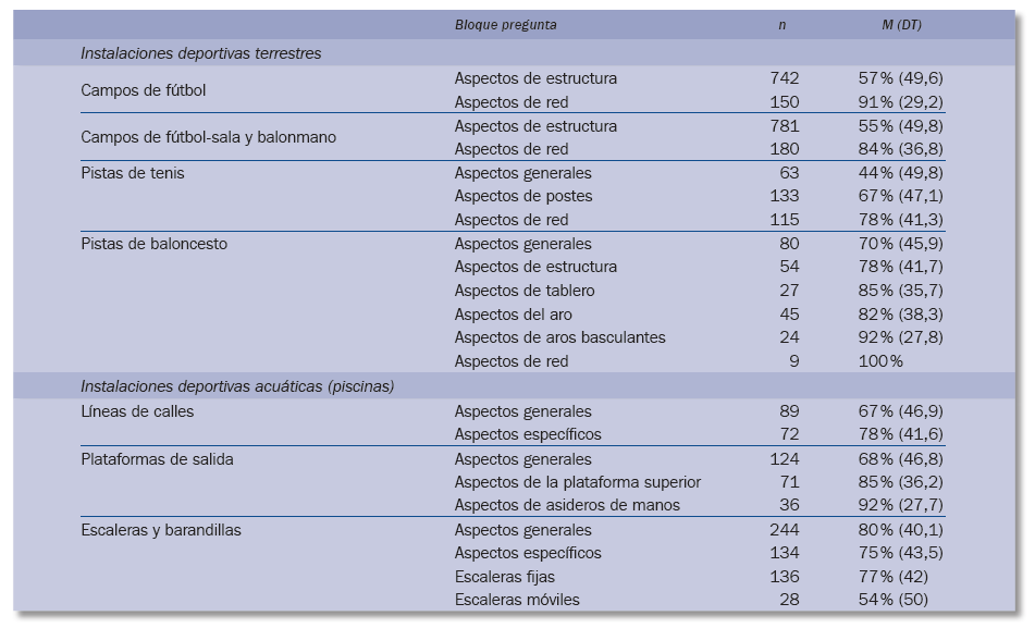 En los espacios convencionales terrestres, los aspectos de estructura (campos de fútbol y fútbol-sala y balonmano) o generales (pistas de tenis y baloncesto) son los que menor porcentaje de seguridad alcanzan mientras que los aspectos de red son los que más seguridad obtienen. En piscinas, de nuevo los aspectos generales son los que menor porcentaje de seguridad alcanzan en líneas de calles y plataformas de salidas (en escalas, escaleras y barandillas es el bloque de preguntas con mayor seguridad). Los aspectos específicos (en líneas de calle) y asideros de manos (en plataformas de salida) son los aspectos con mayor seguridad. En cambio, las escaleras móviles (en escalas, escaleras y barandillas) es el aspecto con menor porcentaje de seguridad (tabla 2).