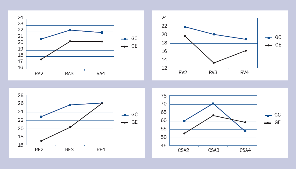 Se encontraron diferencias significativas entre los grupos GC y GE en el momento 2 de nuestra investigación (GE en condiciones de hipoxia a 5.800 m) en las pruebas de RV (p < 0,045), RA (p < 0,002) y RE (p < 0,044).