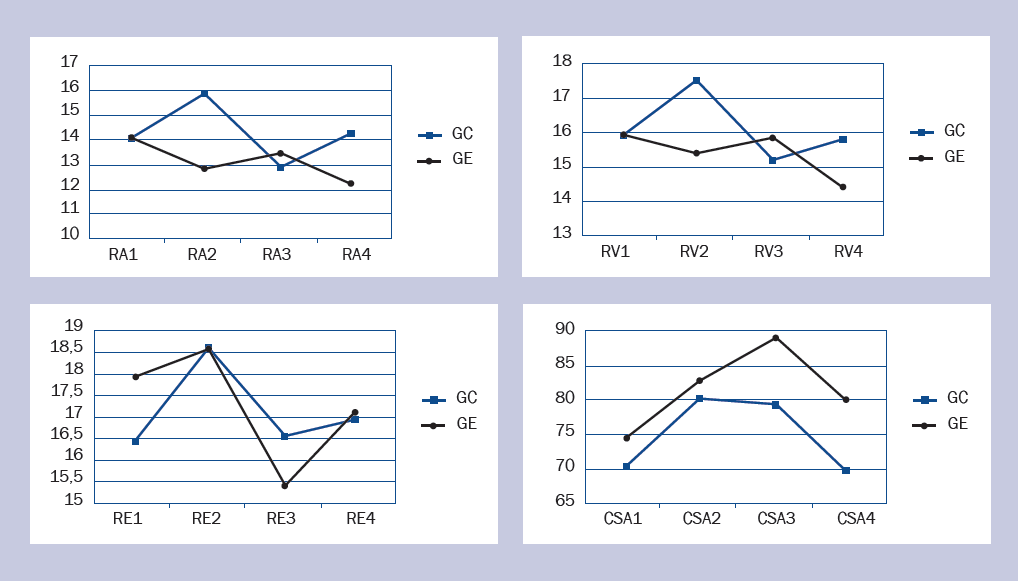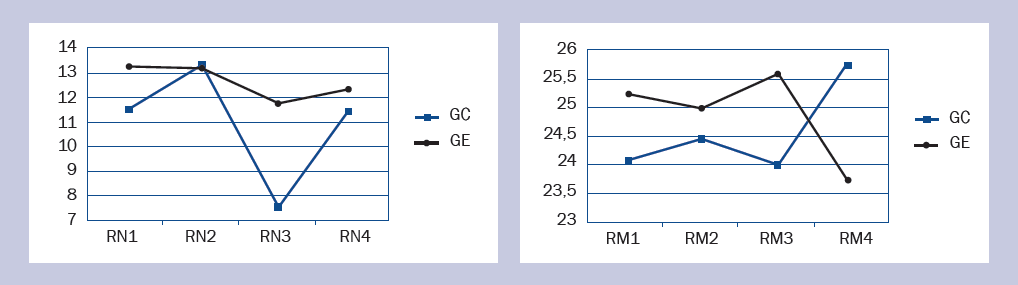 Se encontraron diferencias significativas entre los grupos GC y GE en el momento 3 de la investigación (a la semana del regreso de la expedición) en la prueba de RN (p < 0,05).