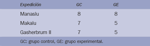 En todo momento se contó con un grupo experimental (GE) que participaba en las expediciones, expuesto por tanto a situaciones de hipoxia. Igualmente, se contó con un grupo de control (GC) que no participaba en las expediciones, no expuesto a dichas condiciones. Los grupos eran similares en cuanto a edad, sexo (todos varones), nivel cultural, preparación técnica y experiencia profesional en alta montaña. Los participantes del GE pertenecían al Grupo Militar de Alta Montaña (GMAM) de Jaca (Huesca), y también era de la misma población el Departamento de Montaña de la Escuela Militar de Montaña y Operaciones Especiales (EMMOE), al que pertenecían los del GC. La totalidad de los participantes contaban con una gran experiencia en alta montaña y un amplio historial de ascensiones. Algunos de los miembros del Departamento de Montaña habían pertenecido con anterioridad al GMAM. Los métodos utilizados con los participantes se realizaron tras la obtención del consentimiento informado de todos ellos. En cuanto al tamaño de la muestra hay que destacar que se ha trabajado con grupos constituidos con anterioridad a la investigación. Respecto al número de participantes, éste se suele considerar normal en expediciones de alta montaña. Evidentemente, en situaciones controladas de laboratorio, como pueden ser los estudios simulados en cámaras hipobáricas, se pueden solventar parte de estos problemas haciendo pasar de manera continua por la misma a un número elevado de personas. Sin embargo, la validez externa del experimento se vería muy afectada, siendo difícil generalizar los resultados encontrados al contexto natural que se pretende. (Tabla 1).