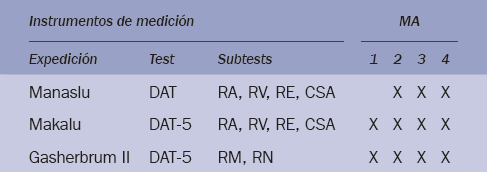 Como instrumentos de medida se utilizaron la adaptación española del Test de aptitudes diferenciales DAT de Bennet, Seashore y Wesman (1995), en sus formas M y L, así como el Test de aptitudes diferenciales DAT 5 de Bennet, Seashore y Wesman (2000), en sus formas 1 y 2. Se trata de pruebas de gran simplicidad y facilidad en la administración, ampliamente utilizadas en el área de la evaluación psicológica y construidas para proporcionar un amplio perfil de información sobre las aptitudes de las personas en múltiples áreas. En concreto, miden el razonamiento verbal (RV), abstracto (RA), espacial (RE), mecánico (RM) y numérico (RN). Igualmente incorporan una prueba de rapidez y precisión perceptiva (CSA), que no siendo una prueba de razonamiento específica como las anteriores, valora la rapidez de percepción, retención momentánea y precisión de las respuestas. Se decidió la inclusión de esta prueba a fin de detectar problemas en la capacidad visual de los participantes. Las formas M y L del DAT se utilizaron en la primera investigación en la expedición al Manaslu (pruebas RV, RA, RE y CSA). En cambio, las formas 1 y 2 del DAT-5 fueron utilizadas en las investigaciones de las expediciones al Makalu (pruebas RV, RA, RE y CSA) y al Gasherbrum II (pruebas RM y RN).
