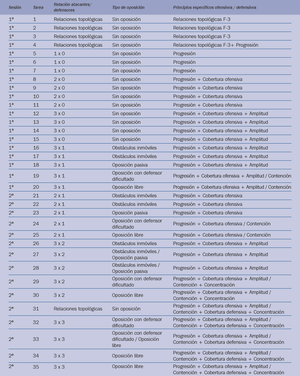 Ahora bien, la mera práctica de F-3 no satisface el respeto a estos principios de juego. Lapresa, Arana, Garzón, Egüén y Amatria (2008), diseñaron una unidad didáctica (publicada en abierto por la Universidad de La Rioja y el Comité Nacional de Entrenadores de la Real Federación Española de Fútbol), con el objetivo de que, en la modalidad de F-3, el juego se vea favorecido por el respeto a estos principios, lo que permitirá una mayor adecuación del desempeño técnico del niño, a partir de unas premisas de juego que fomentan la superioridad numérica del equipo en fase ofensiva (Wein, 1995). En latabla 1y en la figura 1 se presentan de forma esquemática sus 35 tareas constitutivas destacándose: la relación entre atacantes y defensores, el tipo de oposición que tiene lugar, y los principios específicos tanto ofensivos como defensivos que satisfacen.