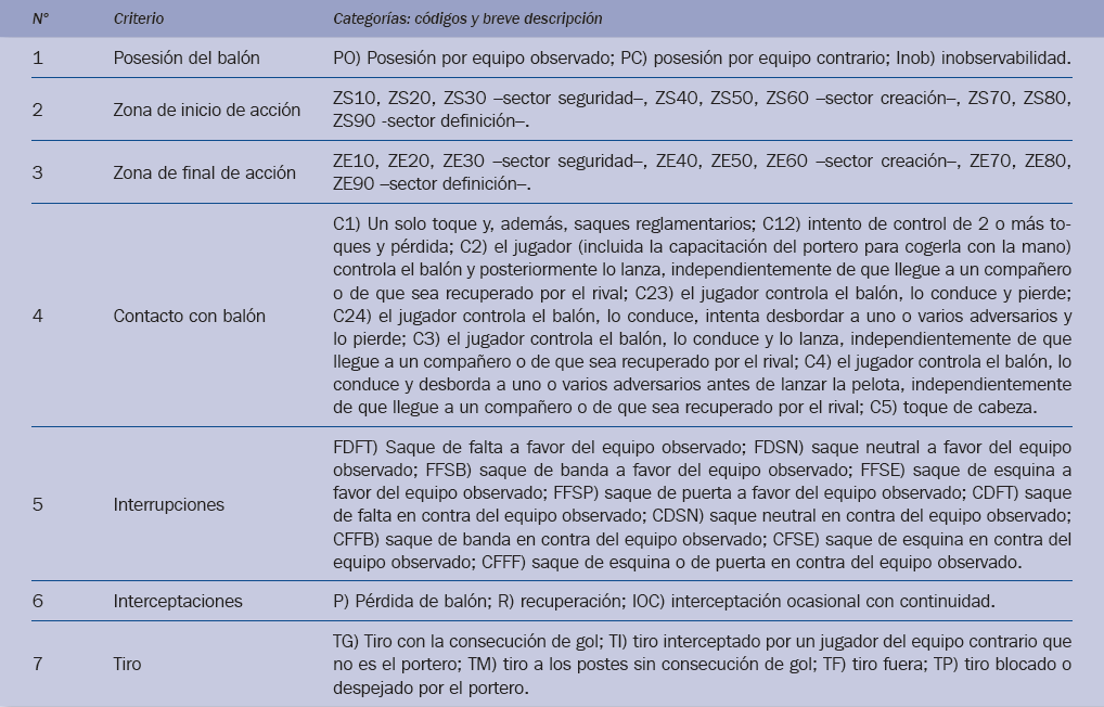 Para la realización de este estudio se ha diseñado un instrumento de observación ad hoc (Castañer, Torrents, Anguera, & Dinušová, 2009), a partir de la estructura de observación recogida en las diferentes versiones del Sistema de Observación en Fútbol, SOF (Jonsson et al., 2006) y la propuesta metodológica para la adaptación de habilidades motrices básicas y genéricas al fútbol para niños de 6 a 10 años elaborada por Lapresa, Arana y Carazo (2005). El instrumento de observación es una combinación de formato de campo y sistemas de categorías (Anguera, Magnusson, & Jonsson, 2007; Planes & Anguera, 2015), ya que cada uno de los sistemas de categorías, exhaustivos y mutuamente excluyentes (Anguera & Hernández-Mendo, 2013), se encuentran anidados en una estructura multidimensional de formato de campo (tabla 2).