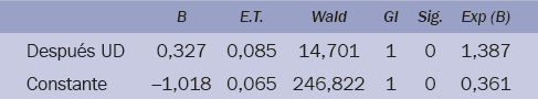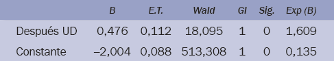 El primer modelo de regresión logística simple no se puede desarrollar debido a que no existe relación estadísticamente significativa entre la variable criterio –éxito/ no-éxito en el contacto– y la variable predictora –juego de F-3 antes y después de la unidad didáctica–. En el segundo (χ² = 14,751; p = 0,000) y tercer modelo (χ² = 18,313; p = 0,000) de regresión logística simple planificados, sí que se constata relación asociativa significativa entre cada una de las variables criterio y la variable predictora. Para la construcción y desarrollo de estos modelos de regresión logística simple, se ha empleado el procedimiento “introducir” que incorpora el paquete estadístico SPSS, versión 19.0.