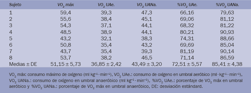 Dichos parámetros ergoespirométricos y respiratorios pueden sernos de ayuda a la hora de valorar la condición física de jugadores de pádel, fundamentalmente la valoración del VO2 máx, juego en el que este valor tiene dos registros. Carrasco, Romero, Sañudo y De Hoyo (2011) registraron valores de 55,64 ± 8,84 ml · kg–1 · min–1 para este parámetro en población practicante masculina de alto nivel. Por su parte, Pradas et al. (2014) obtuvieron para este mismo parámetro valores de 47,33 ± 4,57 ml · kg–1 · min–1 para practicantes de pádel de alto nivel pero categoría femenina. En el caso del presente estudio, en respuesta a uno de los objetivos perseguidos, encontramos VO2 máx de 51,15 ± 5,73 ml · kg–1 · min–1. En este sentido, quedan reflejados como los sujetos practicantes de alto nivel masculino obtienen valores mayores para este parámetro, probablemente fruto de las adaptaciones provocadas por las exigencias de entrenamientos y partidos a las que se ven sometidos en comparación con la población amateur.