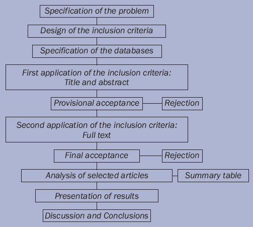 La revisión ha sido realizada utilizando la secuencia de pasos descritos en la figura 1, por lo que se han tenido en cuenta los criterios de inclusión dos veces: la primera, en el título y resumen; y la segunda, en el texto completo haciendo un análisis exhaustivo de cada artículo, para contrarrestar el escaso desarrollo científico sobre el tema.