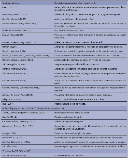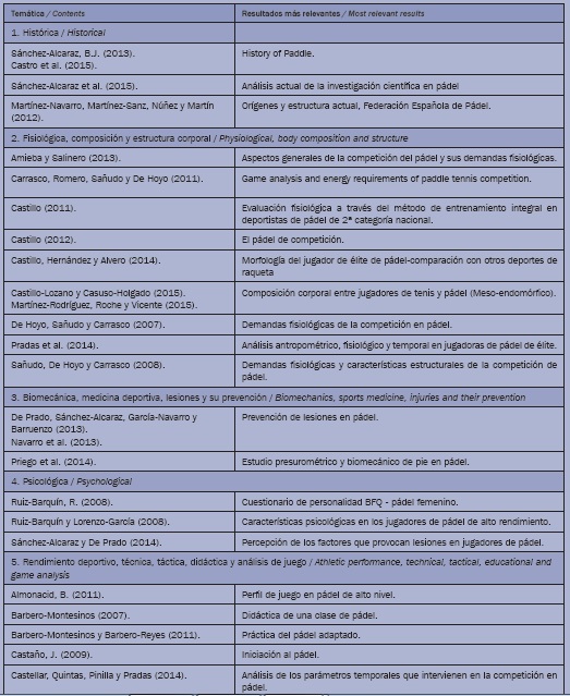 Como resultado de esta revisión se han recopilado los datos más relevantes de los estudios específicos del pádel circunscritos exclusivamente al siglo xxi (desde el año 2000 hasta 2015).