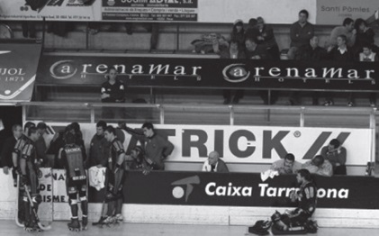 Tiempo muerto en un partido de la OK Liga. Mientras los jugadores de pista reciben instrucciones del entrenador el portero busca la compañía del portero reserva.